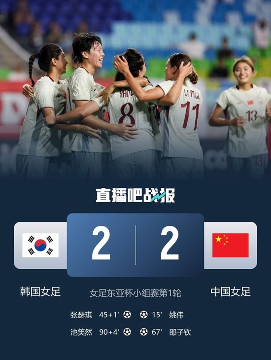直播吧7月9日讯 北京时间7月9日19:00,女足东亚杯小组赛第一轮中国女足挑战韩国女足的比赛在水原世界杯球场进行,上半场姚伟远射世界波首开记录,潘红艳献精彩扑救,姜綵林失单刀,张瑟琪补射扳平,半场结束,中国女足1-1韩国女足。下半场王霜失良机,姚伟助攻邵子钦头球破门,潘红艳失误险送礼,池笑然远射绝平,最终中国女足2-2韩国女足无缘开门红,中国女足下场对手将是中国台北女足。
