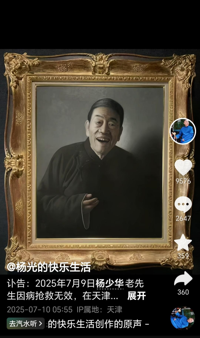 杨少华家人发布讣告 其子社交平台删除“带货”视频