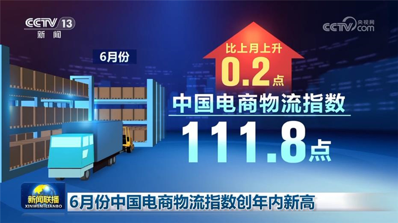 央视新闻客户端消息(新闻联播):中国物流与采购联合会今天(7月9日)公布,6月份中国电商物流指数为111.8点,比上月上升0.2点,指数连续4个月环比上升,并在6月份刷新年内新高。从主要分项指数来看,电商物流总业务量指数稳步回升,农村业务量指数环比涨幅进一步扩大,并且农村业务量同比增速年内首次超过30%。