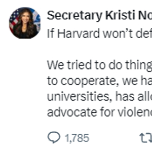 国土安全部部长诺姆说,由于哈佛“拒绝合作”,“我们不得不采取强硬的方式”。她指责哈佛大学和其他一些大学允许“外国学生滥用签证特殊待遇,在校园内鼓吹暴力和恐怖主义”。
