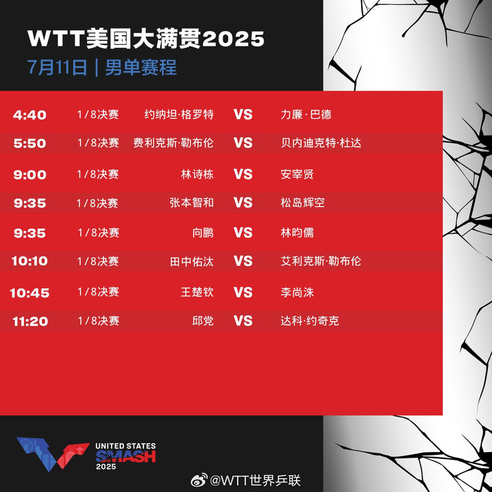 WTT美国大满贯:国乒今天12场比赛 孙颖莎王楚钦一日双赛