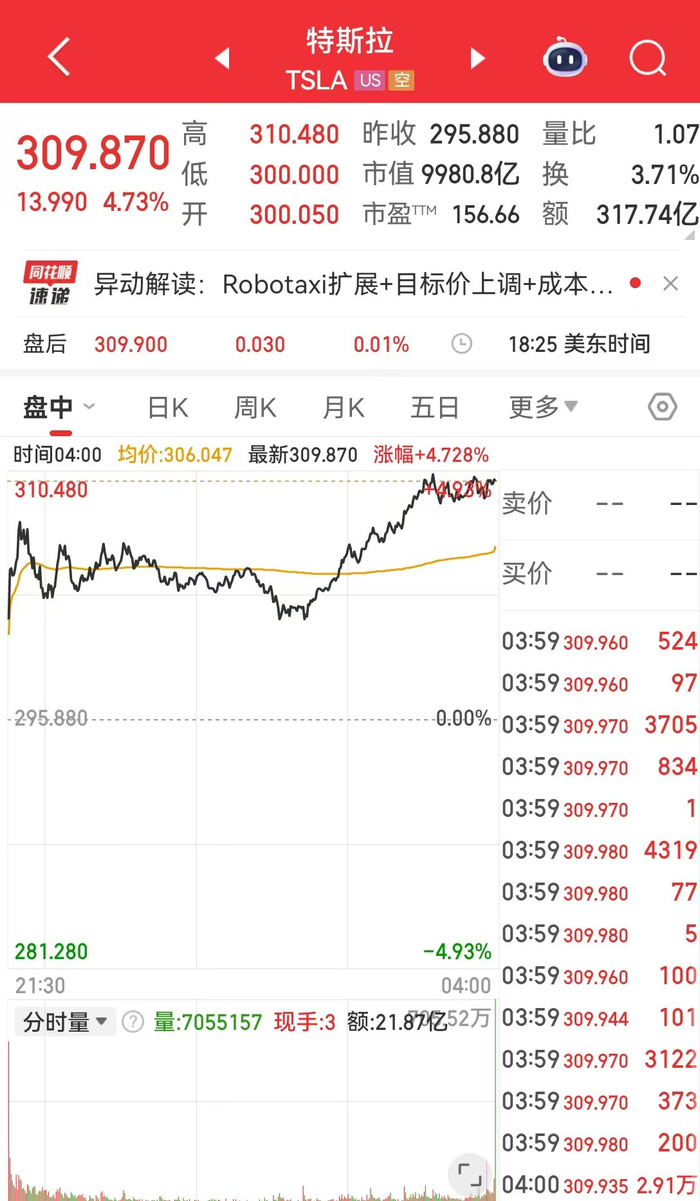 大型科技股涨跌互现,特斯拉报309.87美元,收涨4.73%,最新市值9980.8亿美元,其市值一夜增加451亿美元(约合人民币3236亿元)。