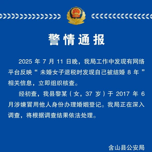 2025年7月11日晚,我局工作中发现有网络平台反映“未婚女子退税时发现自己被结婚8年”相关信息,立即组织核查。