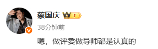 对此,13日下午,蔡国庆转发相关博文,并正面回应争议,称:“嗯,做评委做导师都是认真的”。