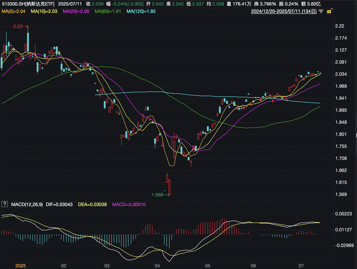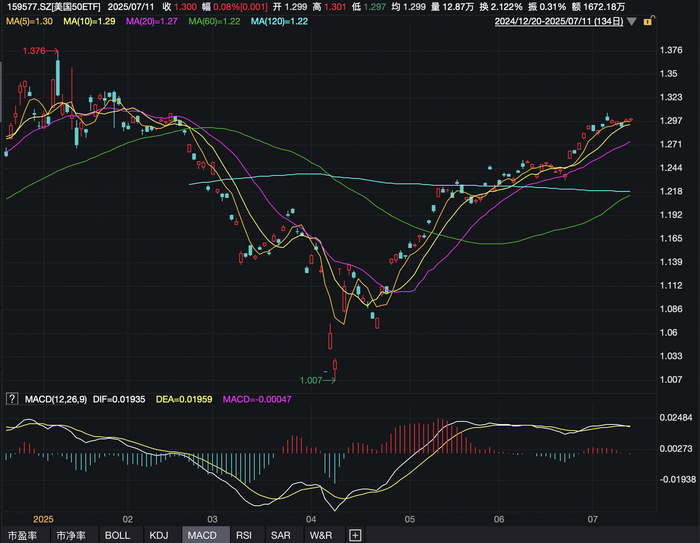 截至上周五(7月11日)收盘,在中国境内上市的跨境美股ETF再度回到历史高点附近(计入美元贬值的因素),纳斯达克ETF、美国50ETF的净值分别报2.039和1.3。