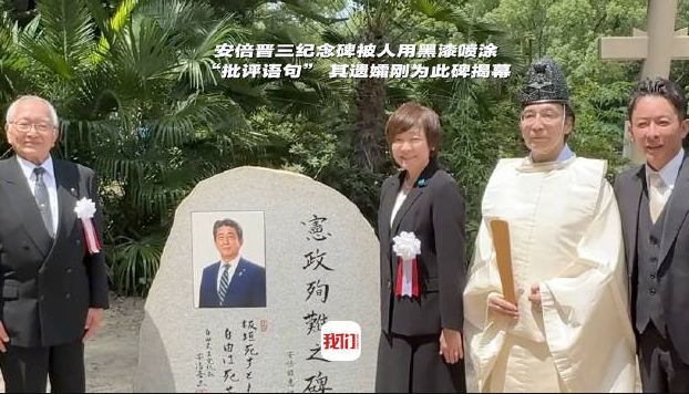 [安倍晋三纪念碑被人用黑漆喷涂 其遗孀刚为此碑揭幕] 7月14日,日本大阪一神社称设在该地的已故前首相安倍晋三“显彰碑”被喷涂黑漆。碑上安倍晋三的照片被喷涂上所谓“诽谤语句”,目前已被擦除。据报道,这座“显彰碑”7月2日设立,安倍的遗孀安倍昭惠6日为碑揭幕。安倍晋三2022年7月8日在街头演讲时遭枪击,经数小时抢救后不治身亡。