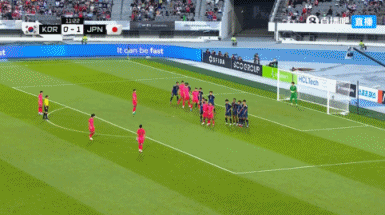 第12分钟,李东炅禁区线附近倒地,主裁判判罚任意球,李东炅亲自主罚,皮球击中人墙弹出↓