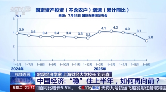 7月15日,国家统计局公布2025年上半年中国经济数据。初步核算,上半年国内生产总值660536亿元,按不变价格计算,同比增长5.3%。下半年,中国经济如何继续保持稳中有进的发展态势?《新闻1+1》本期关注:中国经济“稳”住上半年,如何再向前?