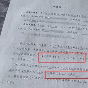 “我这才知道,5月17日邓某便在医调委,与南海第七医院签订了《调解协议书》,上面有写赔偿金额88.8万元。”韦先生说,5月23日前后,邓某让他签《承诺书》,系因为赔偿款到账了,但《承诺书》却没有写具体赔偿金额,“我认为他故意隐藏了该信息。”