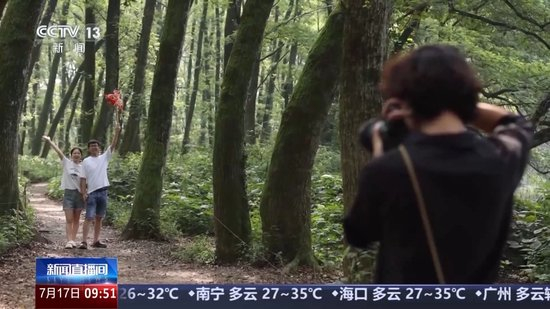 在黄山市徽州区西溪南村,绵延数里的枫杨林湿地中,清澈的丰乐河水穿林而过,游客踩着石块缓步前行,脚下清溪潺潺。林荫小道边,古老的枫杨树绿荫如盖,游客悠然划桨,穿梭在碧波与林荫之间。