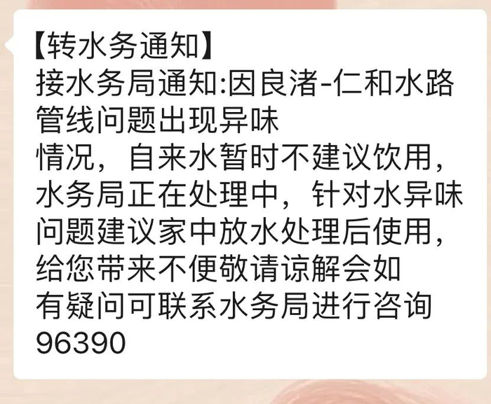 7月16日晚,杭州余杭水务控股集团公众号发布通报:7月16日上午,仁和街道及良渚街道部分区域出现自来水气味异常。该公司立即启动应急预案,切换其他水源供水,组织人员对相关管网开展冲洗。截至当天13时30分出厂水质恢复正常,16时30分主管网已恢复正常,末梢支管尚有“存水”残留,请广大用户排放管道内“存水”至正常后方可使用,将对排放“存水”水费予以减免。具体原因正在进一步调查。