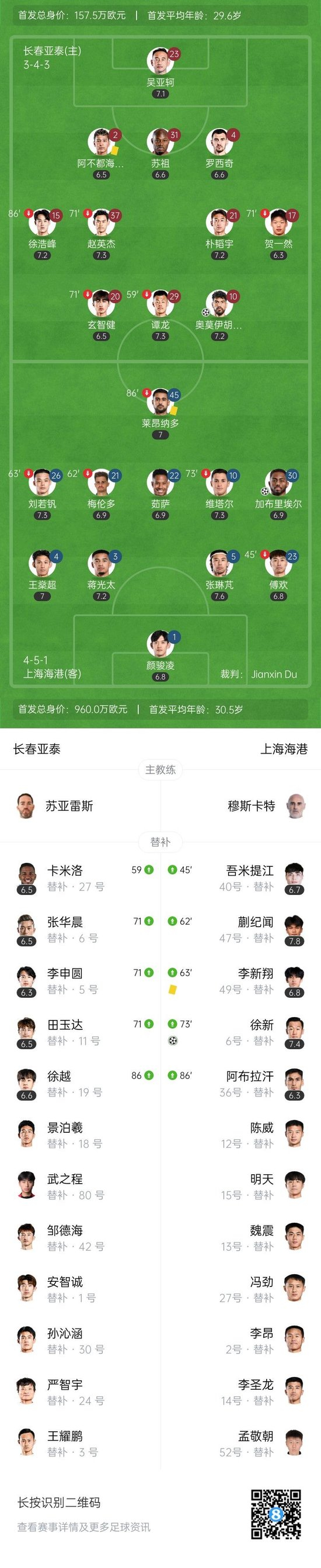 下半场补时11分钟。最终全场比赛结束,长春亚泰1-3上海海港。