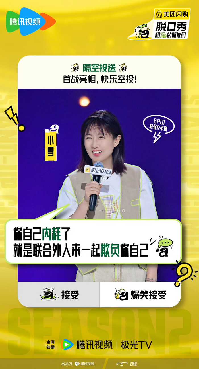 作为拥有线下专场的演员,小雪深知小众演出市场的局限。“认识你的观众不多,卖票就很难。”她坦言,线上节目如同一个放大器,能让更多人知道小雪的专场是好内容。尽管是第一次参加线上脱口秀节目,这位自侃“岁数不小”的演员却笑称:“现在再不上,我就成夕阳红了。”