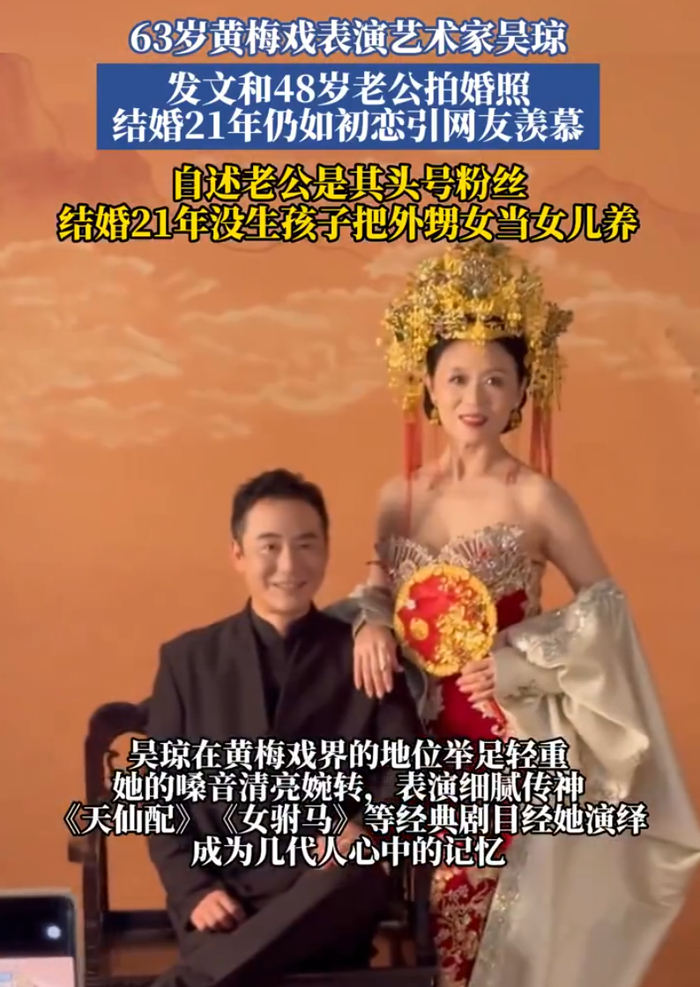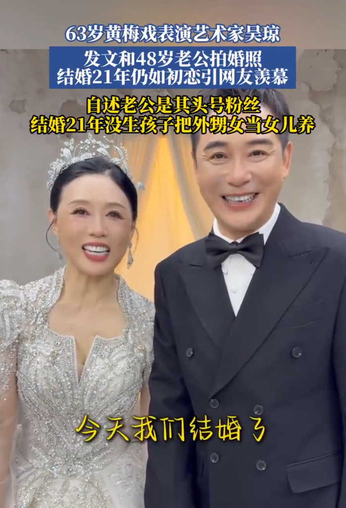63岁黄梅戏艺术家吴琼晒出与小15岁老公婚纱照,结婚21年没生孩子,把外甥女当女儿养