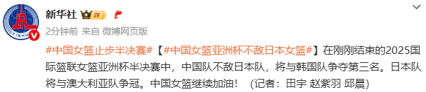 据新华社微博消息,在刚刚结束的2025国际篮联女篮亚洲杯半决赛中,中国队不敌日本队,将与韩国队争夺第三名。日本队将与澳大利亚队争冠。