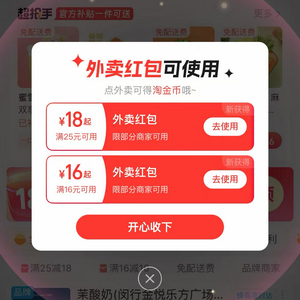 《科创板日报》记者搜索各平台发现,7月19日,美团闪购仍向用户推送“美食兑换券”、“下午茶兑换券”等变相补贴;淘宝闪购频道“满25减18”、“满16减16”等高强度满减活动赫然在列;京东秒送亦未退场,持续提供“满20减18”、“满20减12”等大额优惠。
