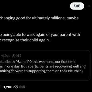 当地时间7月21日,Neuralink在X(原推特)上宣布,公司首次在一天内完成了两位受试者的脑机接口植入手术:“上周末,我们成功完成了P8和P9(第8位和第9位受试者的)手术,这是我们首次在一天内完成两台手术。两位患者恢复状况良好,精神状态良好。”