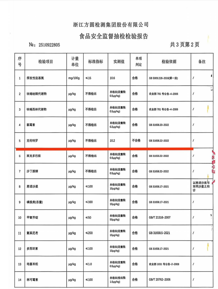 极目新闻记者获取的两份检测报告显示,一家被检查抽样单位是肥西学前教育发展集团有限公司。该公司被检测的是牛里脊肉,抽样日期为4月24日,数量为2.1公斤,样品中“克伦特罗”的数量值为10.2μg/kg,而该项检测标准指标为“不得检出”。5月21日检测单位出具的检验报告给出的结论是:“经抽样检验,克伦特罗项目不符合农业农村部公告第250号《食品动物中禁止使用的药品及其他化合物清单》要求,检验结论为不合格。”