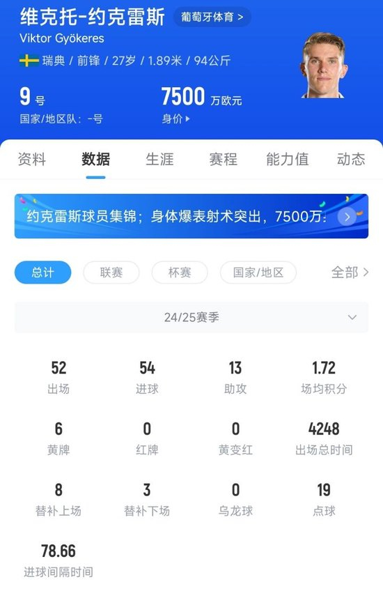 现年27岁的约克雷斯上赛季为葡萄牙体育出战52场比赛,收获54球13助。这位瑞典国脚现身价7500万欧。