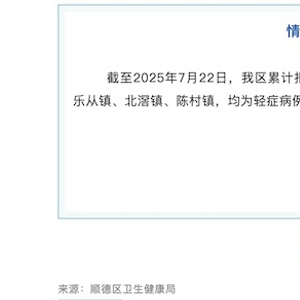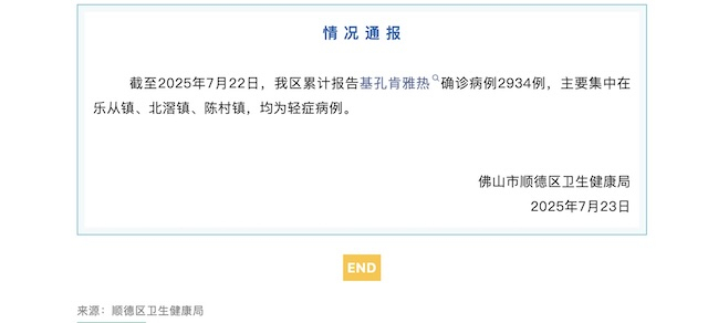 根据广东省佛山市顺德区卫生健康局7月23日的通报,截至2025年7月22日,该区累计报告基孔肯雅热确诊病例2934例,主要集中在乐从镇、北滘镇、陈村镇,均为轻症病例。