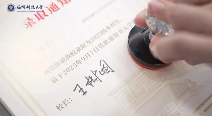 据小乔讲述,他是在7月23日收到福耀科技大学录取通知书的。小乔展示的通知书显示,通知书编号为:FYUST20250001,入学报到时间为2025年9月7日,通知书上还有校长王树国的亲笔签名。
