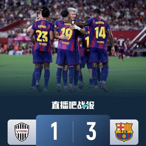 直播吧7月27日讯 北京时间7月27日18点,足球友谊赛,神户胜利船对阵巴塞罗那。上半场,巴塞罗那攻势占优,加西亚捅射破门,库巴西后场带球失误,宫代大圣扳平比分。下半场,两队均大规模换人,巴德吉和德罗先后破门。最终巴塞罗那3-1神户胜利船。