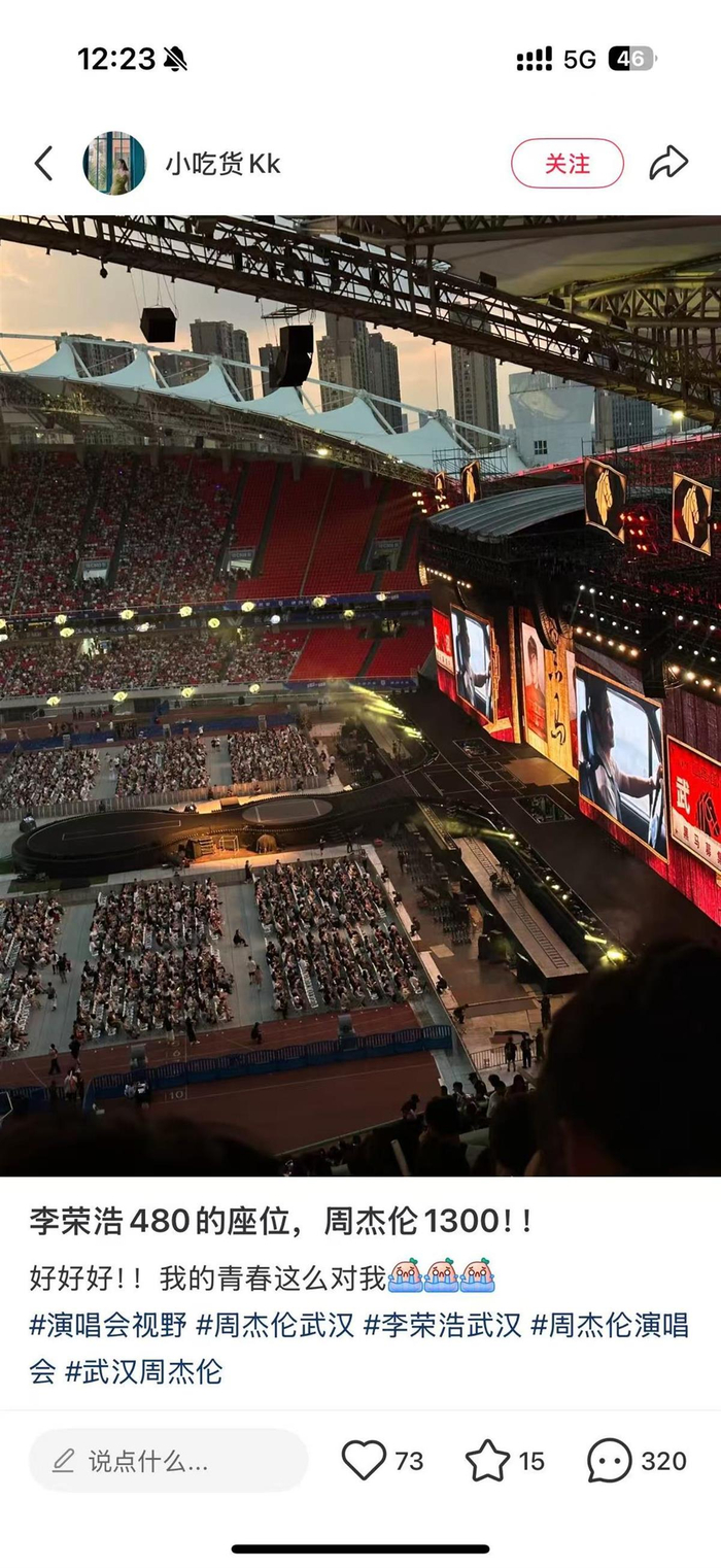 值得一提的是,28日周杰伦2025”嘉年华“演唱会武汉站票图出炉后,有网友吐槽表达不满,原因是,售价2000元的”至尊VIP“内场票档被划分出了6块区域,靠近中控台、在体育场内很可能肉眼看不清周杰伦样子的VIP坐席,卖到了1800元,内场中靠近大屏幕的A区票,买到了1600元。也有网友表示:想买1300元的看台,但很可能会被发配到山顶。而相同的位置,李荣浩武汉演唱会只卖480元。