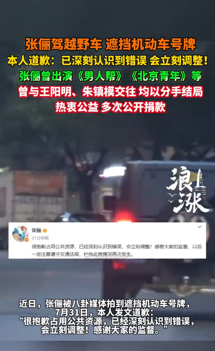 曝女演员张俪疑似遮挡机动车号牌,本人发文道歉:已经深刻认识到错误