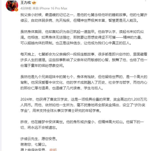 王力宏还回顾了2024年许倬云获得唐奖汉学奖,随即将1200万元人民币的奖金捐出设立“许孙奖学金”的过往,“昨夜,他在睡梦中安详离世。他的身形或许瘦小,但精神高大如山。他留下的一切,将永远不会被遗忘。”