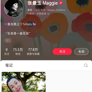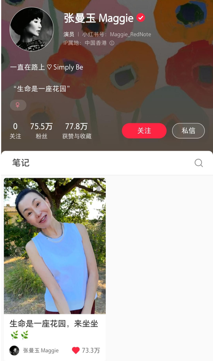 8月8日,张曼玉开通了自己的小红书账号,并上传了一段个人视频。8月10日,张曼玉小红书个人主页显示,她目前仅上传一条视频,点赞已有73.3万,粉丝量已达75.5万,两天时间涨粉超75万。