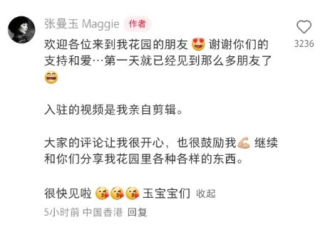 10日,张曼玉在该视频评论区发文感谢大家的支持和爱,并称视频是由自己亲自剪辑的,很快会和大家再见:“入驻的视频是我亲自剪辑。大家的评论让我很开心,也很鼓励我继续和你们分享我花园里各种各样的东西。”