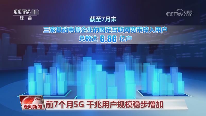记者从工业和信息化部了解到,今年前7个月,通信业运行总体平稳,5G、千兆用户规模稳步增加。截至7月末,三家基础电信企业的固定互联网宽带接入用户总数达6.86亿户。其中,千兆宽带接入用户占总用户数的三分之一;5G基站总数占移动基站总数的36%,5G用户在移动电话用户总数中的占比,超过六成。