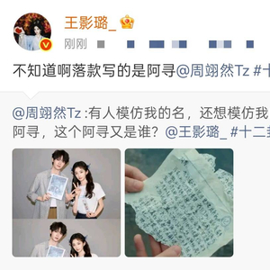 “有人模仿我的名,还想模仿我的字!我是阿寻,这个阿寻又是谁?”8月29日晚,演员周翊然更新自己的微博,并@王影璐。王影璐随后回复,“不知道啊落款写的是阿寻@周翊然”。两人一来一往,为电视剧《十二封信》的开播打call。