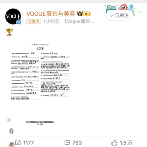 时尚杂志《VOGUE》正式官宣辛芷蕾即将喜提单人封面 图据《VOGUE》微博截图