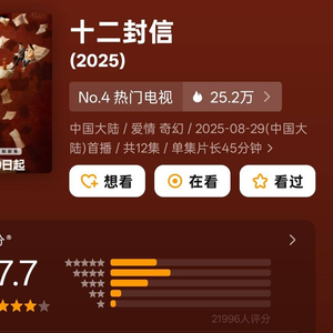 9月12日,由韩三平监制,沙维琪执导,程小猫、程梦琰、沈思吉担任编剧,周翊然、王影璐领衔主演,郑合惠子、任宥纶特邀出演的双时空命运救赎情感剧《十二封信》豆瓣开分7.7,有不少观众分享自己的观后感,称“这剧真的巨下饭,妥妥电子榨菜”。