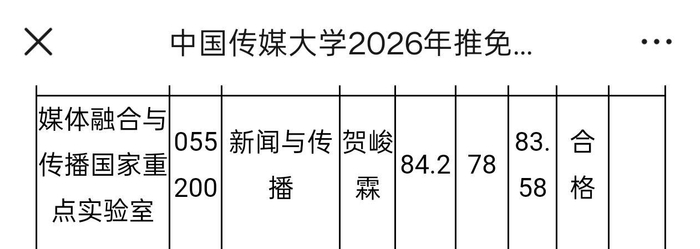 2025年9月22日,中国传媒大学公示2026年推免预报名复试合格和备选合格人员名单。其中,在媒体融合与传播国家重点实验室的新闻与传播专业一栏,时代少年团成员贺峻霖也在其中。