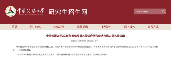 此次中国传媒大学公示的2026年推免预报名复试合格和备选合格人员名单备注写道:“对于我校2026年推免生预报名复试合格人员,如获得本科就读学校2026年研究生推免资格,并报考我校研究生(报考专业须与预报名复试合格人员名单公示中的专业相同),可直接拟录取。”“对于2026年推免生预报名复试备选合格人员,我校将根据推免生实际录取情况进行递补,请及时关注通知。”