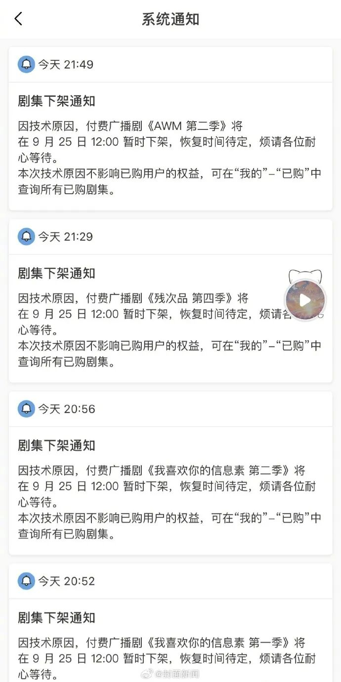 9月24日,猫耳FM发布系统通知,又有超50部作品于25日12点集中下架,同为音频平台的漫播也同步下架了20余部作品。