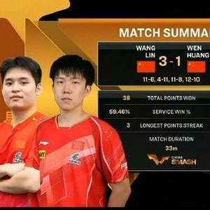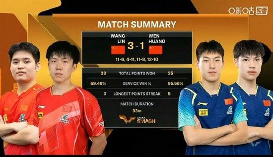 直播吧10月3日讯 WTT中国大满贯男双半决赛,王楚钦/林诗栋3-1战胜队友黄友政/温瑞博,挺进决赛。