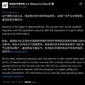 #美驻华使领馆官号宣布停更#[美国驻华使领馆:拨款出问题,不会定期更新了]北京时间10月3日下午1时23分,美国驻华使领馆在美国社交平台X上的官方账号上宣布,由于拨款问题未解决,除紧急的安全和安保信息外,此账户将不会定期更新,直至恢复全面运作。