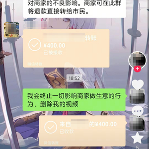 10月7日,红星新闻记者注意到,当事男子已于10月6日晚在自己的抖音账号上发布消息称老板给他退了400元。男子发布的聊天记录截图显示,在三人群聊中,一人发布消息称“基于双方自愿调解,商家表示愿意退费市民400元,市民同意停止对商家的不良影响,商家可在此群将退款直接转给市民。”随后,当事男子表示会“终止一切影响商家做生意的行为,删除我的视频”并在群聊中接收了400元转账。