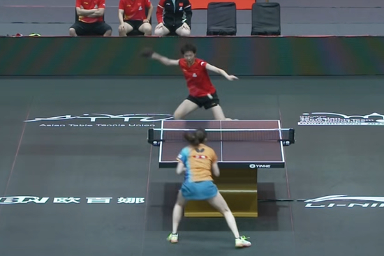 第三盘,蒯曼8-11、12-10、11-6、11-9战胜早田希娜。