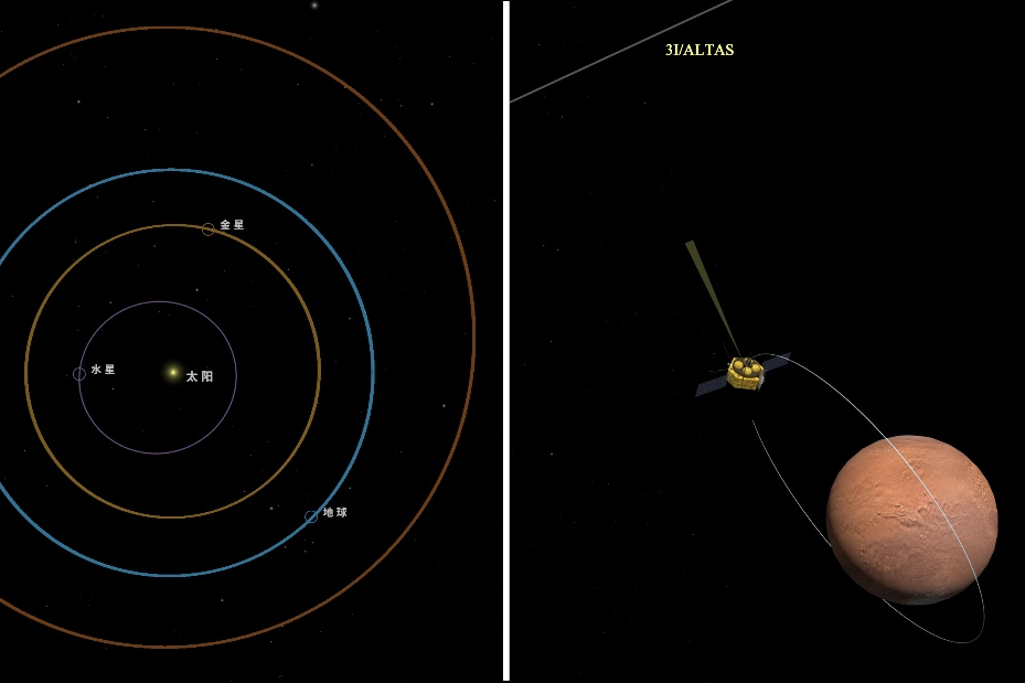 △星际天体阿特拉斯与天问一号火星环绕器相对位置示意图(右图是2025年10月3日相机拍摄时左图的局部放大)