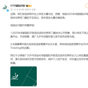 近期,我们发现网络平台上存在大量代抢、预售、倒卖2025年成都国际乒联混合团体世界杯门票的不实言论,其中混杂大量诈骗信息。