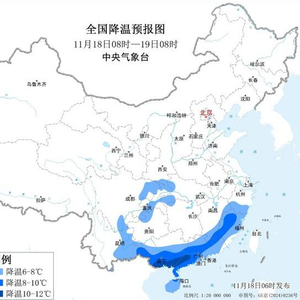 受强冷空气影响,预计,11月18日8时至11月19日8时,四川东部和南部、重庆、江西东部和南部、浙江南部、云南东部、广西、广东、福建、海南岛等地大部将先后降温6~8℃,其中,广西南部、广东西南部等地部分地区降温可达10℃。最低温度0℃线将南压到苏皖南部至湖北中部一带。