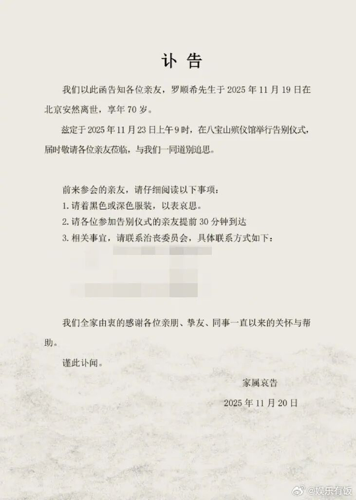11月20日,罗晋经纪人在朋友圈发讣告:罗晋先生的父亲罗顺希先生于11月19日在北京安然离世,享年70岁,告别仪式于11月23日在八宝山殡仪馆举行。