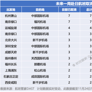 据航班管家DAST数据,截至11月24日10点,已有12条中日航线取消所有航班。