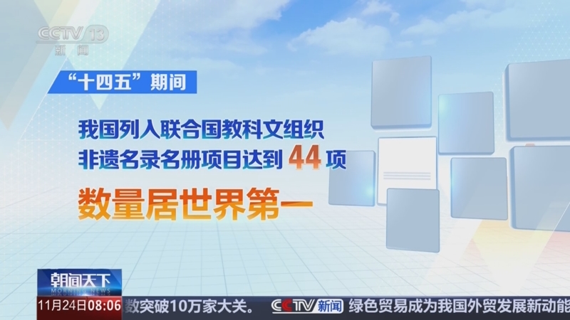 “十四五”期间,我国列入联合国教科文组织非遗名录名册项目达到44项,数量居世界第一。