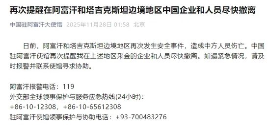 此外,中国驻阿富汗使馆也再次提醒我在上述地区采金的企业和人员尽快撤离。如遇紧急情况,请及时报警并联系使馆寻求协助。
