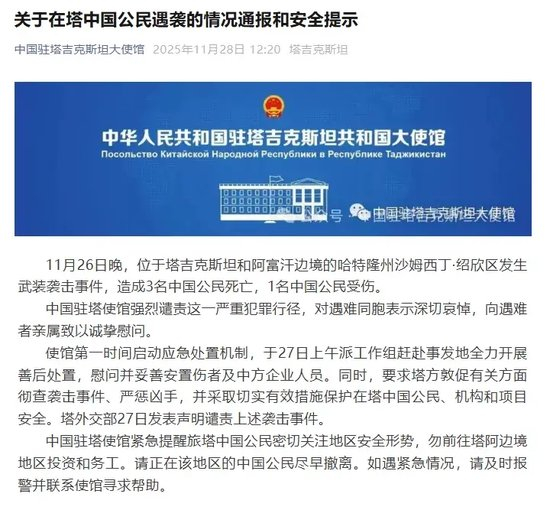 11月28日,中国驻塔吉克斯坦大使馆发布通报,26日晚,位于塔吉克斯坦和阿富汗边境的哈特隆州沙姆西丁·绍欣区发生武装袭击事件,造成3名中国公民死亡,1名中国公民受伤。29日,极目新闻记者核实了解到,死伤者中,有3人来自甘肃文县中庙镇,具体为2人死亡1人受伤,他们均系出国务工人员,从事淘金行业相关工作。